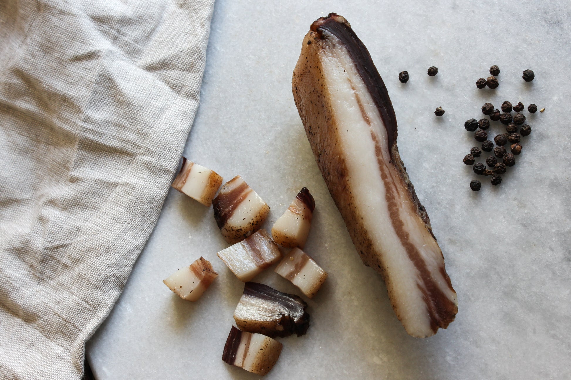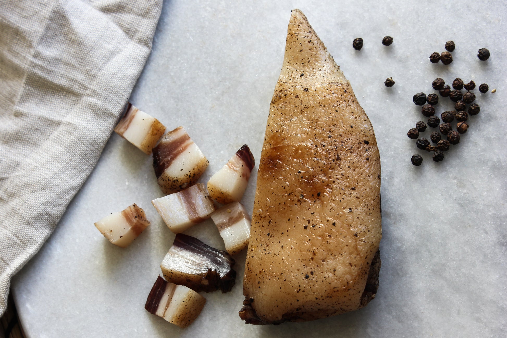 We make our guanciale by hand from our woodland reared pork, simply spiced with organic black pepper. Guanciale is used at the start of dishes like ragu or carbonara but it can also be used as a pizza topping, in a quiche or as a base for a stew.