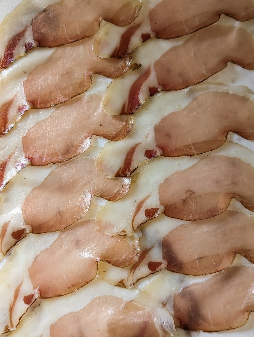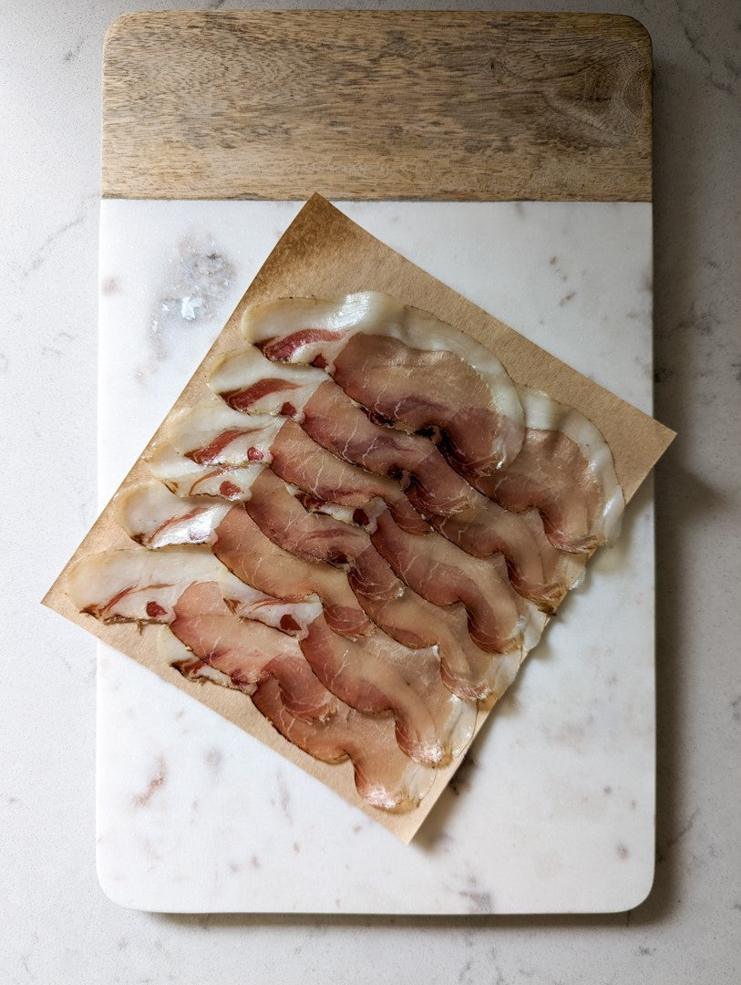 Our Lonzo is made by curing the pork loin. We use a blend of red pepper flakes with white peppercorns which gives a fruitiness with a little heat.